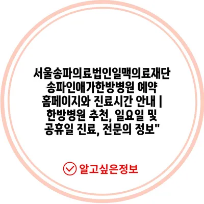 서울송파의료법인일맥의료재단 송파인애가한방병원 예약 홈페이지와 진료시간 공지 | 한방병원 추천, 일요일 및 공휴일 진료, 전연락 정보에 대해 자주 묻는 질문 TOP 5